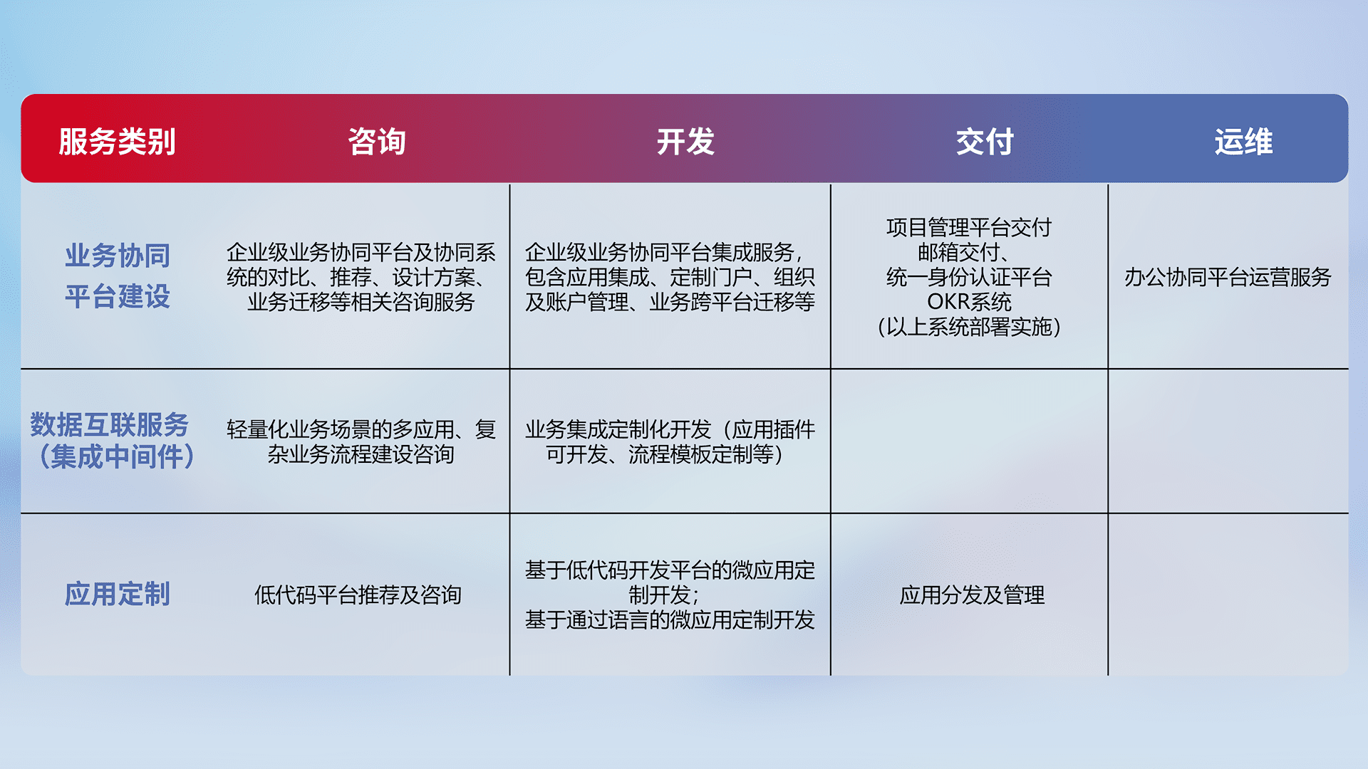 针对钉钉、、、、企微、、、IDaas等平台级产品提供产品的规划、、、方案、、、、交付、、定制化开发等服务,,,实现如统一协同办公、、、智能客户服务、、、混合会议管理、、、智能数据查询、、、等业务场景,,,实现数字化转型。。。。
